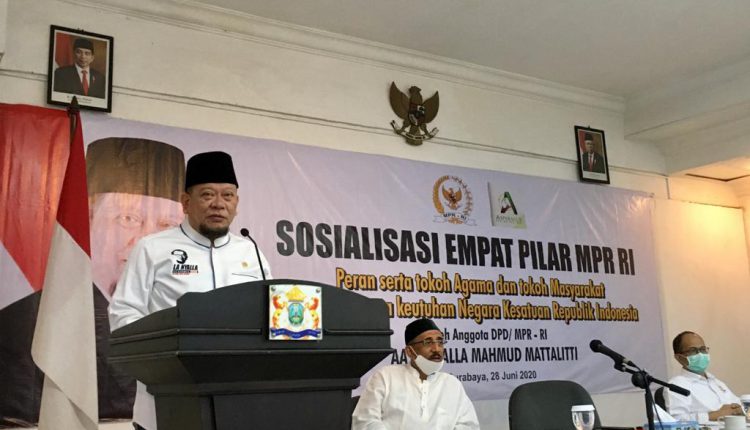 SURABAYA – Dinamika sosial maraknya penolakan atas Rancangan Undang-Undang Haluan Ideologi Pancasila (RUU HIP) mendapat perhatian khusus dari anggota DPD-MPR RI AA LaNyalla Mahmud Mattalitti. Hal itu disampaikan dalam acara Sosialisasi Empat Pilar di hadapan sekitar 50 pengasuh pondok pesantren se Jawa Timur di Surabaya, Minggu (28/6/2020).