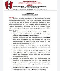 Dengan maraknya dinamika dan isu- isu yang dilakukan oleh oknum yang mengatasnamakan DPC GMNI Surabaya sebagai pola memecah bela Organisasi GMNI khususnya di Surabaya, maka dengan ini DPC GMNI Surabaya memutuskan Pernyataan Sikap sebagai langkah yang tegas dan tertib di dalam Organisasi.