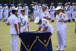 Lintas Surabaya, Surabaya – Komandan Pangkalan Utama TNI AL (Danlantamal) V Laksamana Pertama TNI Eko Wahjono bersama Ketua Korcab V DJA II Ny. Dian Eko Wahjono menghadiri upacara Serah Terima Jabatan (Sertijab) beberapa jabatan strategis di Lingkungan Koarmada RI antara lain Pangkoarmada I dan Pangkoarmada II serta Dankoppeba Koarmada RI di Lapangan Arafuru Mako Koarmada RI Jakarta, Rabu (09/08/2023).