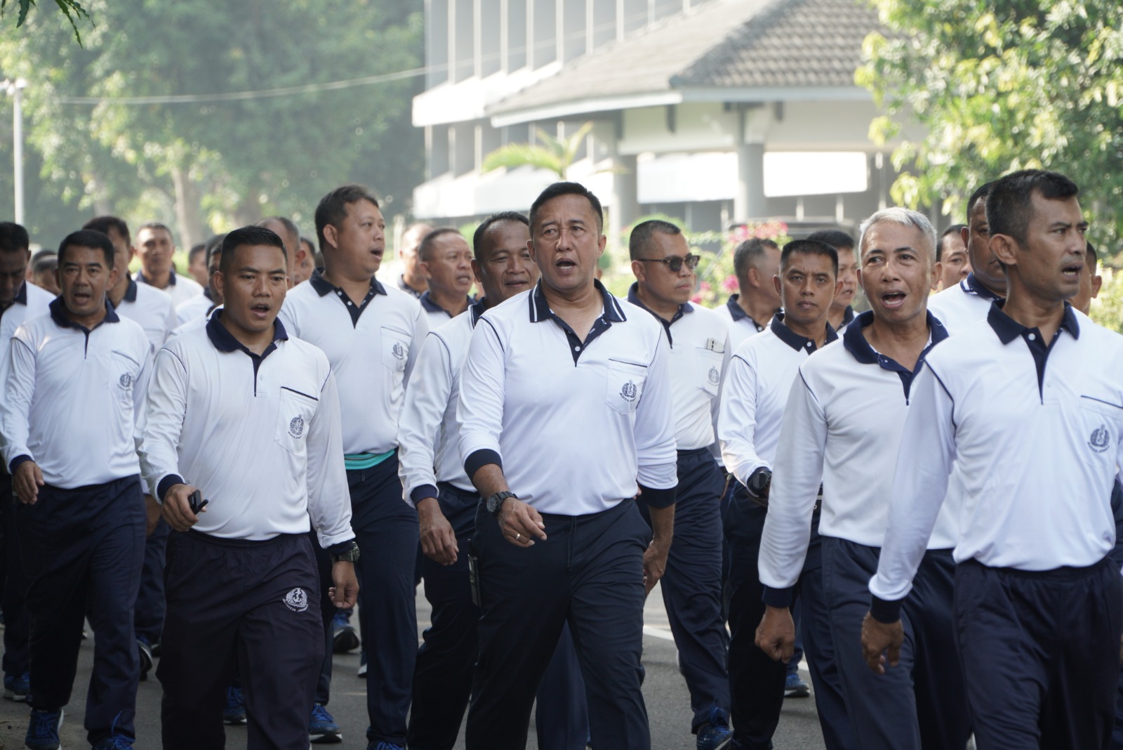 Olah raga rutin hari Selasa ini dilaksanakan penuh semangat tinggi dan bergembira sambil bernyanyi bersama tidak boleh saling menyalip antar sesama pasukan dalam barisan yang harus tetap rapi dan disiplin. (S nto)