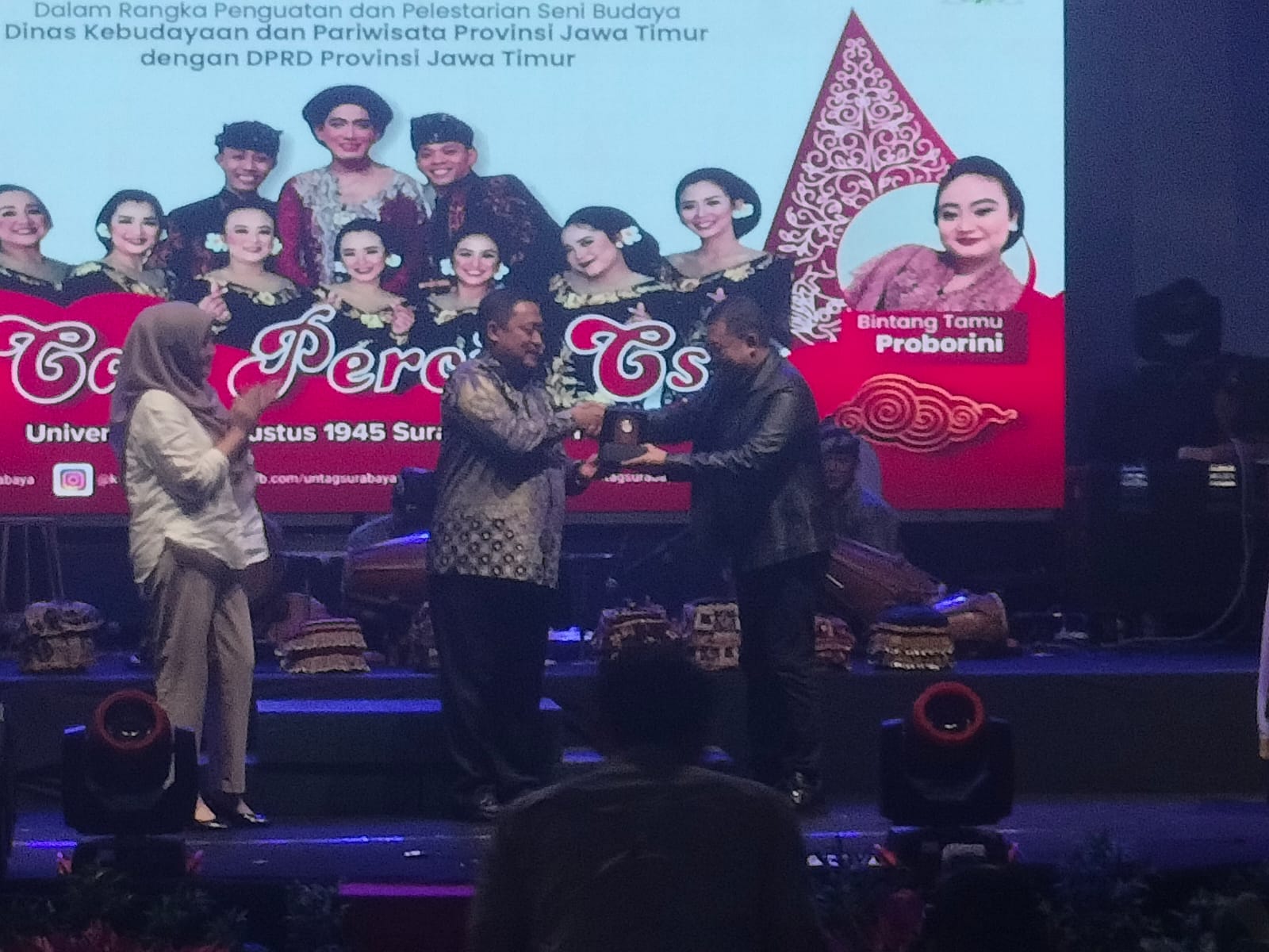 Sedangkan Kadisbudpar Jatim Evy Afianasari dalam kesempatannya mengajak Mahasiswa Untag Surabaya maupun hadirin yang menonton pertunjukan tersebut untuk bersama sama melestarikan kebudayaan Indonesia.