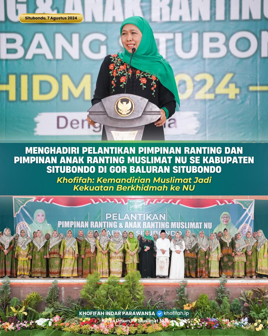 Hal itu ditegaskan Khofifah saat melantik pimpinan Ranting dan pimpinan Anak Ranting Muslimat NU se Kabupaten Situbondo di GOR Baluran Situbondo, Rabu (7/8/2024).