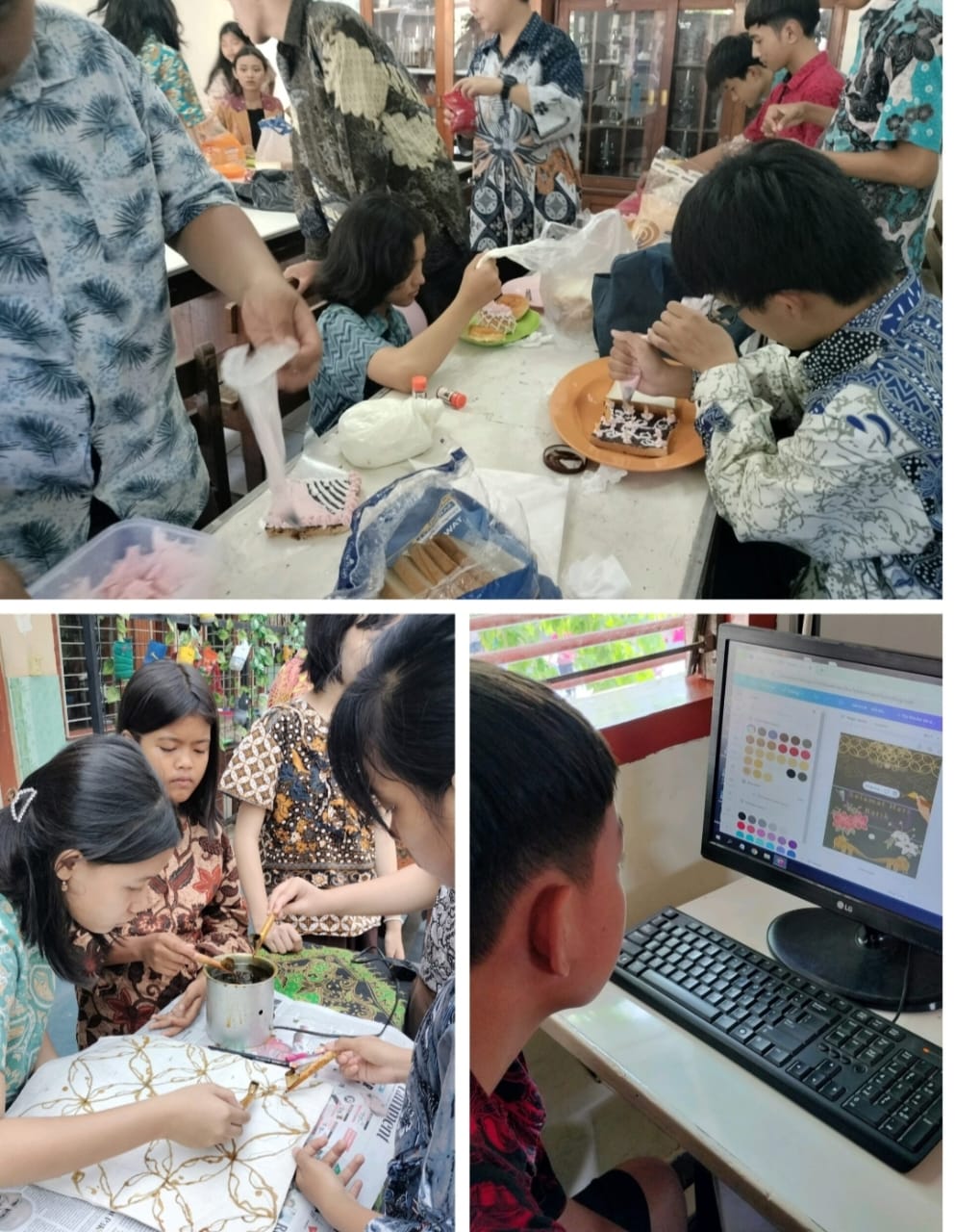 “Untuk kelas VII, yang saat ini mempelajari seni rupa khususnya seni batik dekoratif, proyek mereka adalah membuat batik di media. Sementara itu, siswa kelas VIII dalam pembelajaran Teknologi Informasi dan Komunikasi (TIK) saat ini sedang membuat poster dengan mengaplikasikan motif batik secara digital. Jadi, ada proyek pembelajaran berbasis teknologi. Sedangkan untuk kelas IX, yang saat ini mempelajari prakarya, proyek mereka berfokus pada pengolahan makanan. Mereka diminta membuat kue dekoratif dengan motif ornamen batik, entah itu menggunakan roti tawar atau spiku, tetapi hiasannya harus bermotif batik. Proyek ini juga akan dinilai sebagai bagian dari pembelajaran mereka,” jelas Titris Hariyanti Utami.