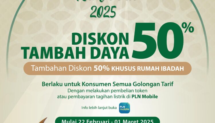Lintas Surabaya, Jakarta – PT PLN (Persero) kembali menghadirkan promo menarik berupa diskon tambah daya 50% untuk seluruh pelanggan di semua golongan tarif dan tambahan diskon 50% khusus pelanggan rumah ibadah melalui program “Menyambut Ramadan 2025”. Cukup dengan melakukan 1 kali transaksi pembelian token atau pembayaran tagihan listrik via aplikasi PLN Mobile, pelanggan bisa menikmati promo yang berlaku mulai 22 Februari 2025 hingga 1 Maret 2025.