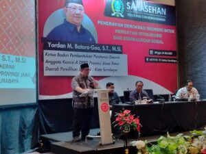 Lintas Surabaya, Surabaya — Anggota DPRD Provinsi Jawa Timur dari Fraksi PDIP, Yordan M. Batara-Goa, S.T., M.Si., menegaskan pentingnya penerapan demokrasi ekonomi sebagai solusi atas persoalan intoleransi dan kesenjangan sosial di Indonesia. Hal ini disampaikannya dalam acara Sarasehan bertajuk “Toleransi dan Keberagaman” yang digelar pada Minggu, 4 Mei 2025 di ARTOTEL TS Suites Surabaya.