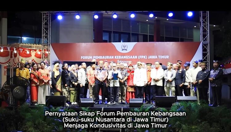 SURABAYA,lintassurabaya.com – Forum Pembauran Kebangsaan (FPK) Provinsi Jawa Timur menegaskan dua pernyataan sikap yang dibacakan Sekretaris FPK, H. Muhammad Alyas, SH, MH, yakni menolak segala bentuk gerakan yang mengatasnamakan masyarakat Jawa Timur untuk mendiskreditkan pemerintah karena berpotensi memprovokasi dan memecah belah persatuan, serta mendukung penuh Pemerintah Provinsi Jawa Timur di bawah kepemimpinan Gubernur Khofifah Indar Parawansa untuk melanjutkan program pembangunan demi kesejahteraan masyarakat sesuai rencana jangka menengah dan panjang. Pernyataan ini diserahkan kepada Kepala Bakesbangpol Jawa Timur, Eddy Supriyanto, S.STP., M.PSDM, untuk diteruskan kepada Gubernur Jawa Timur.