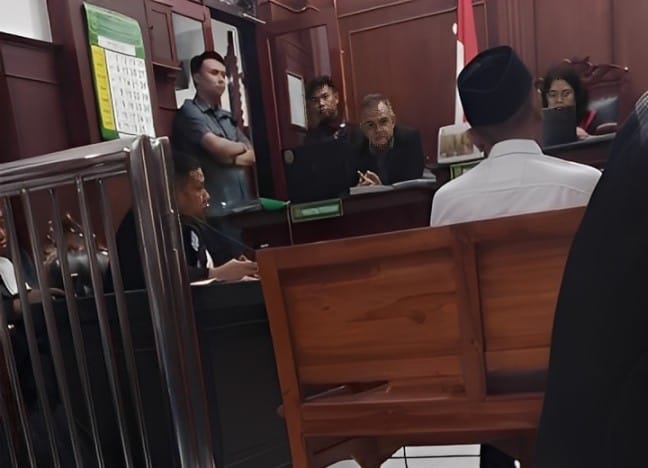 Begitu pula dengan pelaku dengan baju berwarna hijau. Sorot matanya terlihat memperhatikan satu per satu pengunjung sidang. Tatapan mata sok jagoan sangat terlihat. Hingga akhirnya, menemukan wartawan Memorandum.co.id yang sedang duduk di kursi pengunjung sidang. Dengan mata melotot tatapan itu tak dipalingkan sama sekali.
