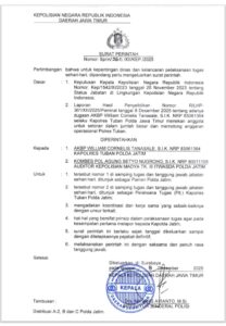 Surabaya, Lintas Surabaya — Polda Jawa Timur resmi mengeluarkan Surat Perintah Nomor: Sprin/2611/XII/KEP./2025 pada 8 Desember 2025 terkait penonaktifan sementara Kapolres Tuban, AKBP William Cornelis Tanasale, S.I.K. Surat tersebut diterbitkan berdasarkan hasil penyelidikan internal atas dugaan penerimaan setoran yang melibatkan orang nomor satu di Polres Tuban itu.