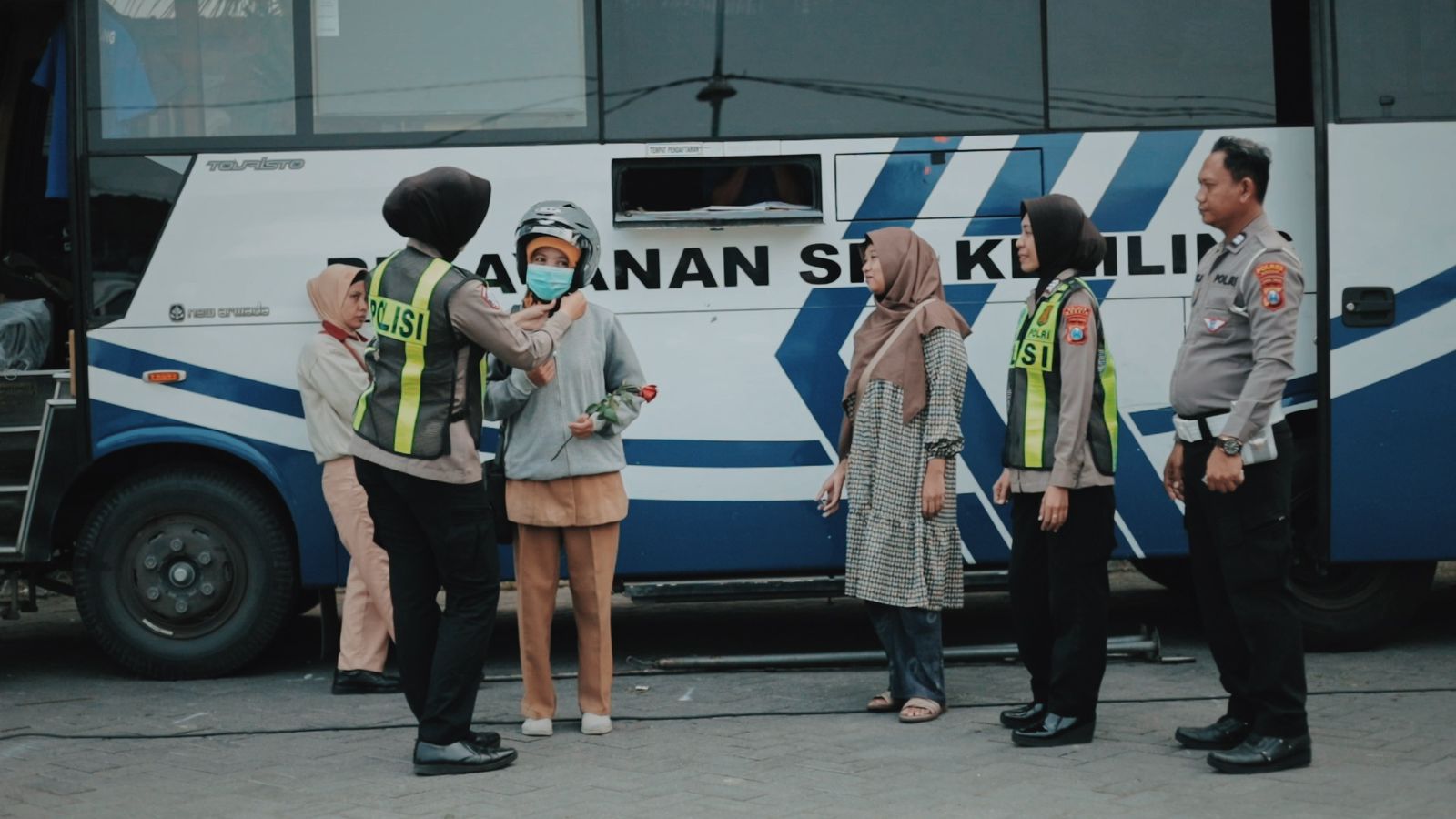 Tak hanya berbagi bunga, kegiatan juga diisi dengan edukasi interaktif. Para Polwan mengajak pemohon perempuan berdialog santai seputar etika dan keselamatan berlalu lintas.